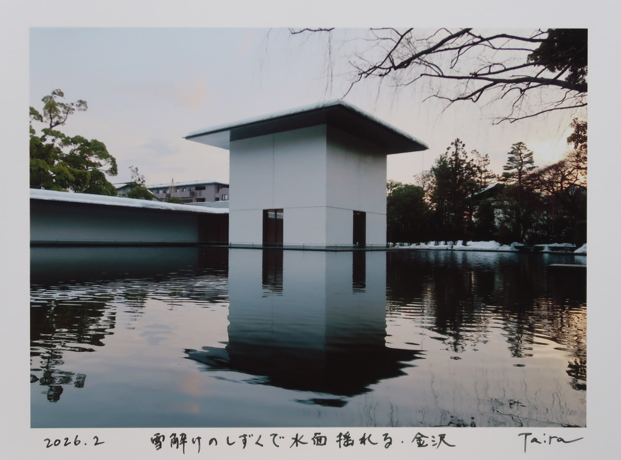 | 2026年2月24日(火) 閉館間際に行った鈴木大拙館は人が少なく 雪の残るその白い建物を静かに撮ることが出来た 雪解けの雫が水面に落ちる音と 定期的に水面を揺らす循環ポンプの ボゴッという音が敷地内に響いていた なかなか撮るのが難しい建物だなと思いながら 瞑想もせずに色々と歩き回った 白い建物向いの 水面に伸びている外部回廊が 建物のセンターまで伸びてないのが なんだか深い意味があるような気がして 谷口さんの才能をすごく感じた なかなか立ち去り難かった 閉館時間がきたので外に出て残雪を踏みながら歩いた ふり返るとトキ色に染まる夕暮れの空の色が 微かに白い建物に映っていた いいものを残してくれましたと 感謝を告げて帰った |